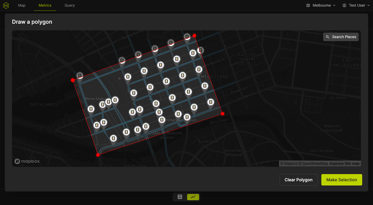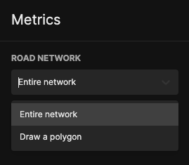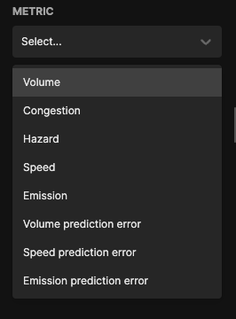 Metrics are statistics about the road network in the selected Region. This can include the average speed, congestion, hazard, or emission of the entire road network or a polygon.