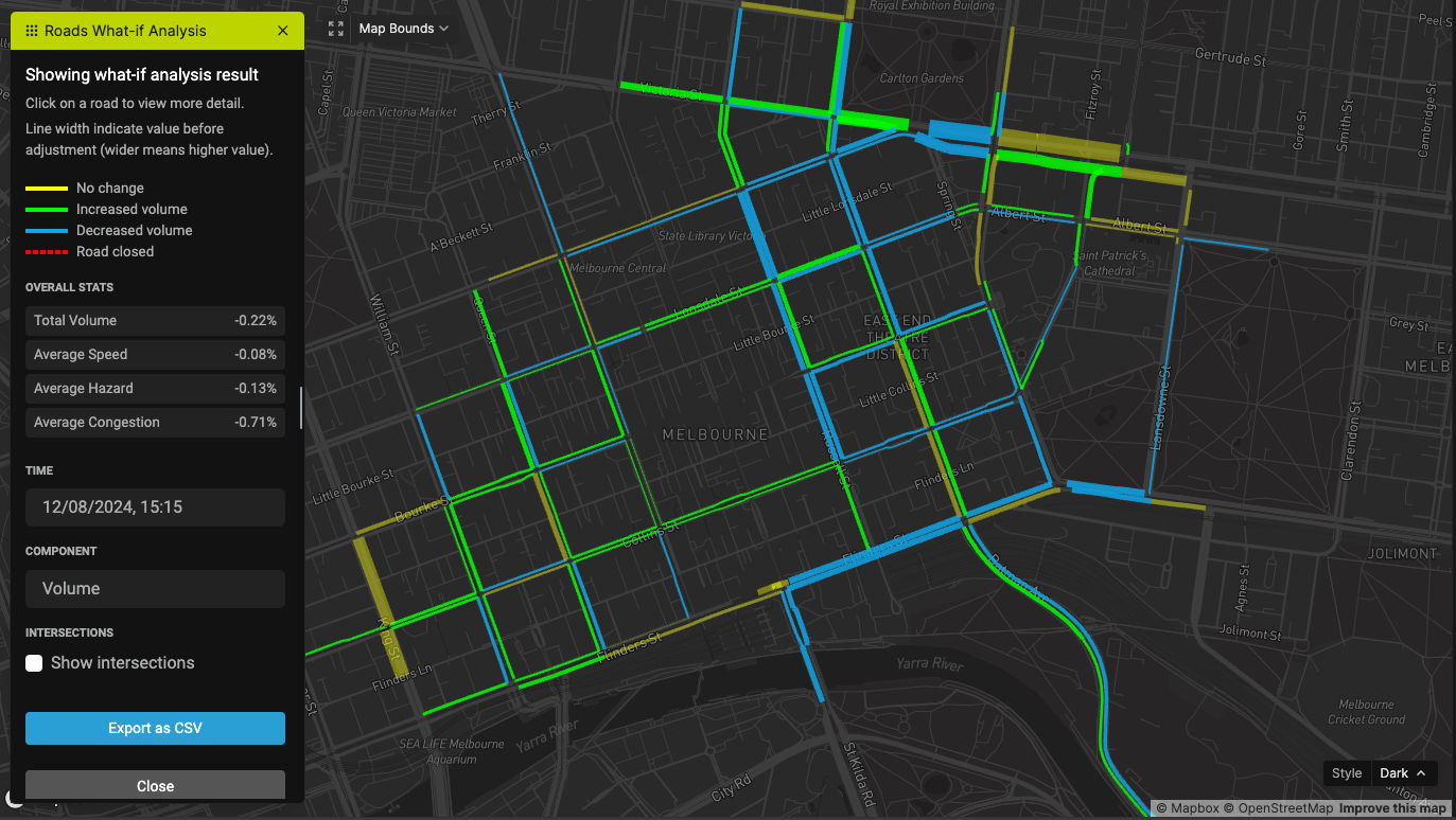 Once you've configured everything, click on "Analyse Roads" to start the what-if analysis. The process will take 10 to 50 seconds, depending on the size of the network and your configuration.