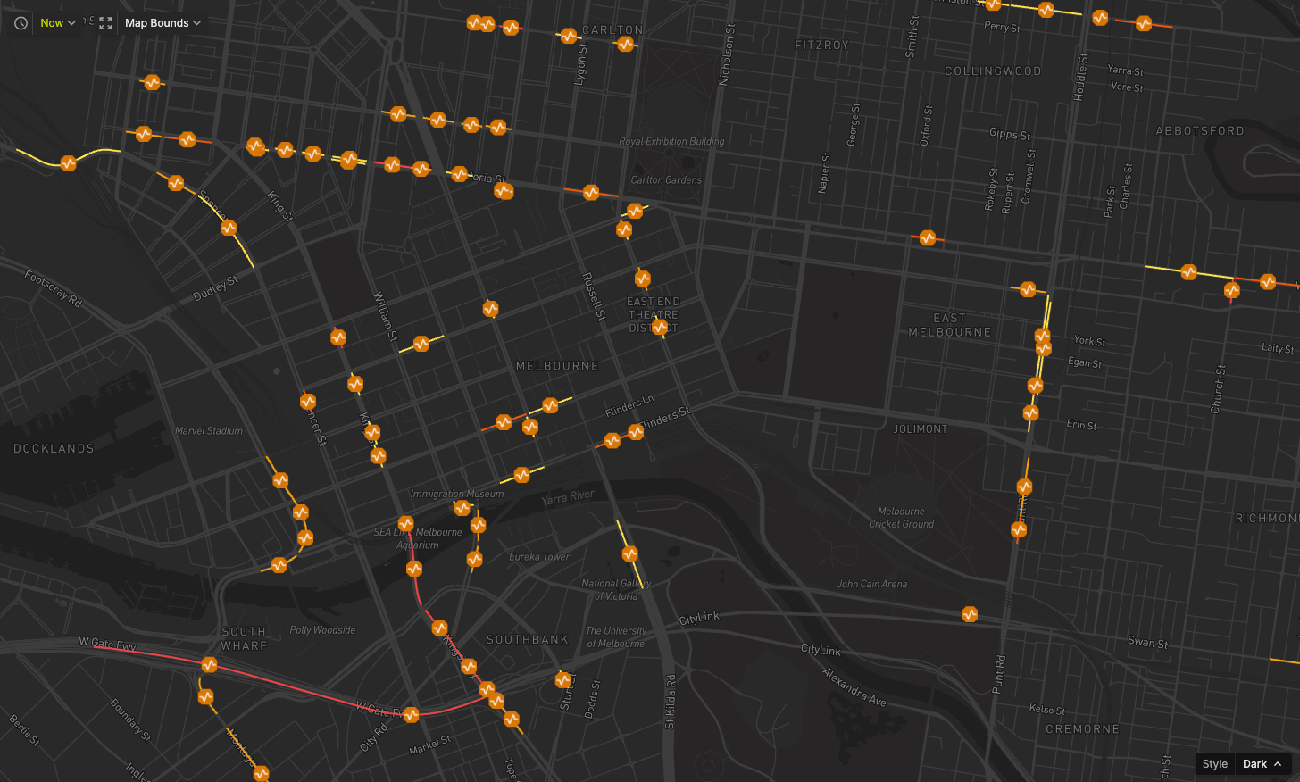 Anomalous Links layer flags Links that have an anomalous speed and volume values. An anomaly in speed and volume may indicate unusual congestion, road closures, or incidents.